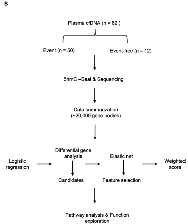 本研究共納入62例2型糖尿病病人,包括沒有血管并發(fā)癥的病人12例,有單一血管并發(fā)癥的病人34例(24例發(fā)生大血管事件,10例發(fā)生微血管事件),以及有多種血管并發(fā)癥的病人16例。試驗收集62例病人血漿,提取cfDNA,利用5hmC-Seal技術捕獲外周血cfDNA中的5hmC序列,進行二代測序,通過生物信息學分析找出并發(fā)癥組與無并發(fā)癥組之間有顯著5hmC修飾差異的基因,單一并發(fā)癥組和多種并發(fā)癥組之間有顯著5hmC修飾差異的基因。隨后利用回歸模型對差異基因進一步篩選、優(yōu)化,彈性網(wǎng)絡進一步篩選,計算加權平均分,最后得到一組具有高度靈敏度和特異性的5hmC生物標記物,并進一步在實驗組中驗證,分析其靈敏度和特異性。并將新建立的5hmC標志物基因組合的檢測性能與傳統(tǒng)臨床變量進行對比分析。最后對相關基因進行了信號通路分析和功能探究。