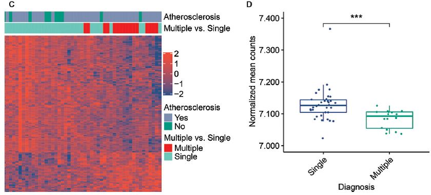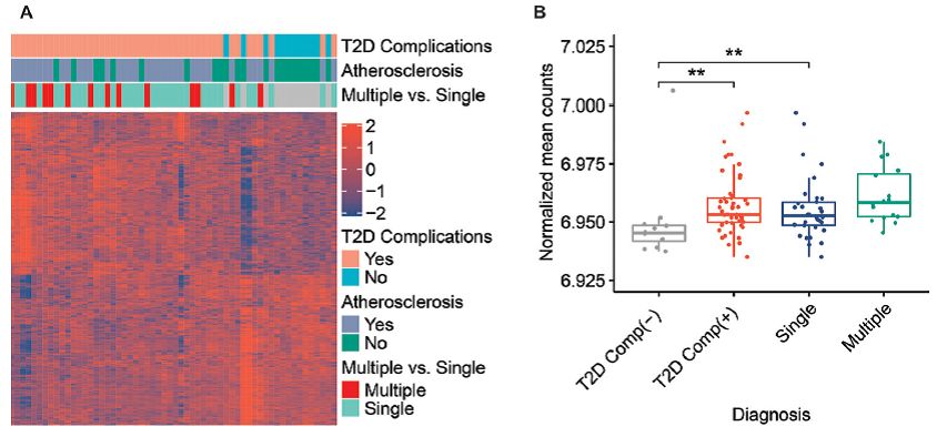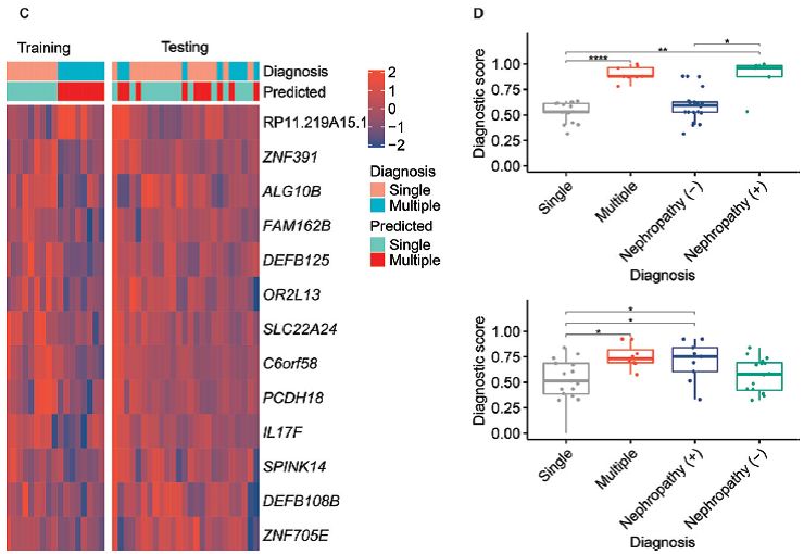 之后將有單一并發(fā)癥或多種并發(fā)癥的50例病人用邏輯回歸模型進行了對比,發(fā)現(xiàn)多種并發(fā)癥的病人的153個差異修飾候選基因(包括上調和下調基因)的歸一化平均數(shù)要低于無并發(fā)癥病人(P<0.001)。
