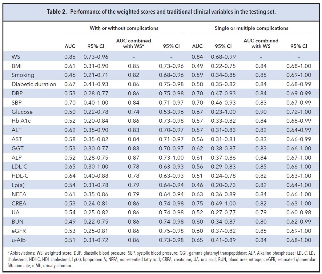 總體來說,結果表明一些臨床變量(如尿液白蛋白、血清ALT、AST、肌酐、GGT、脂蛋白a)雖然具有一定的靈敏度和特異性,但是整體準確度仍然差強人意,因此臨床需要更加準確的方法。另外,我們還在訓練組中建立5hmC和不同臨床變量的多變量組合模型進行評估,該模型加權平均分的AUC要明顯大于傳統(tǒng)臨床變量的AUC。若將這些臨床變量與加權平均分進行結合,AUC也將進一步提高。因此,該多變量模型表明加權平均分可作為一個獨立的指標用于監(jiān)測2型糖尿病血管并發(fā)癥。
