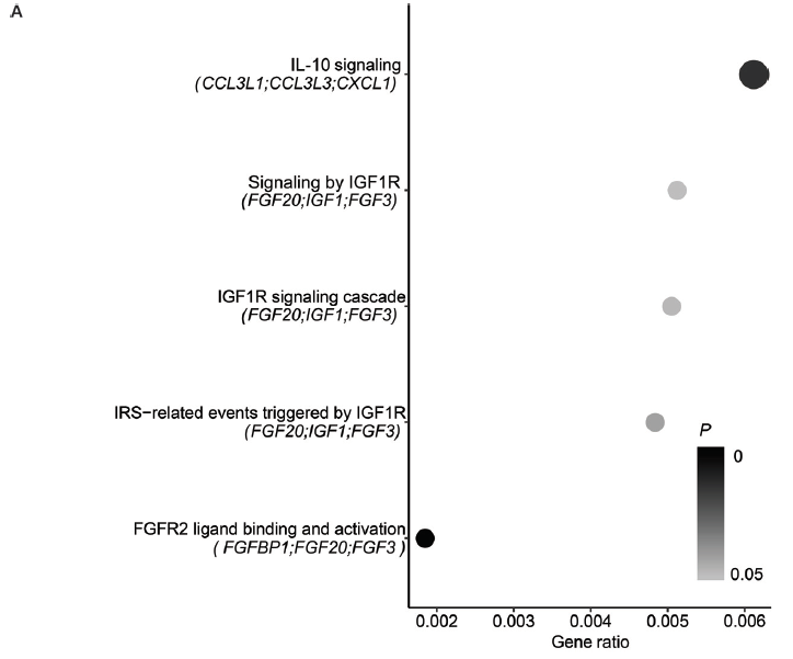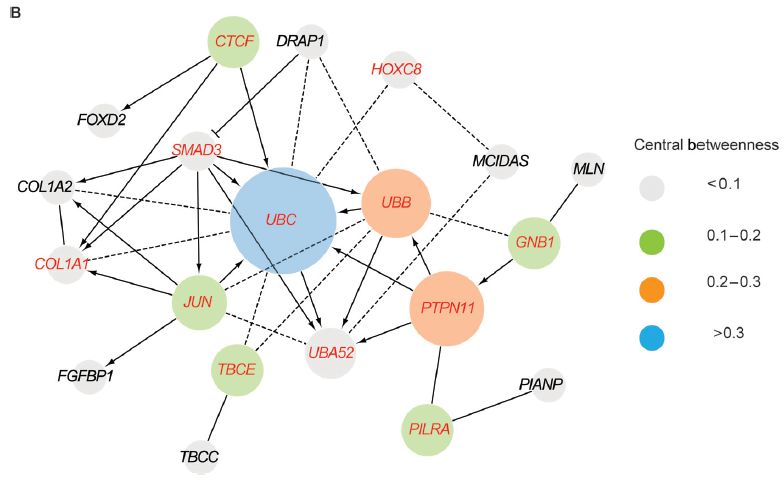信號通路分析和功能探究 有并發(fā)癥和無并發(fā)癥病人的135個差異候選基因的功能注釋分析表明,這些基因主要富集在一些經(jīng)典的信號通路。錯誤發(fā)現(xiàn)率相關P值位于前10%和基因數(shù)目≥3的信號通路包括由IGF1R, IL-10和FGFR2所介導的信號通路。由IGF1R和IL-10介導的信號通路與胰島素抵抗及炎癥反應相關,在血管生物學和糖尿病發(fā)生發(fā)展過程中發(fā)揮重要作用。 Reactome相互作用網(wǎng)絡的中心表明,泛素編碼基因[泛素B (UBB),泛素C (UBC),泛素A-52亞基核糖體蛋白融合產(chǎn)物1(UBA52)]是候選基因(如SMAD3, FOXD2, DRAP1, MCIDAS, MLN, PIANP和TBCC)的重要連接者。在這135個差異候選基因中, 一些基因 (如TNFRSF25,P=0.027, HR=6.25; MLN, P=0.0021, HR=20.40; CCL3L1, P=0.018, HR=0.44)表現(xiàn)出與糖尿病病程相關的傾向,表明5hmC和糖尿病血管并發(fā)癥之間可能存在時間依賴性的相互作用。基于縱向時間隊列的大樣本研究,將可進一步明確5hmC變化和糖尿病持續(xù)時間之間的動態(tài)關聯(lián)。關于單一并發(fā)癥和多種并發(fā)癥病人的159個候選標志基因的功能注釋研究發(fā)現(xiàn),存在細胞-細胞連接、膠原蛋白形成、新陳代謝、細胞應激應答信號通路的富集,這些信號通路均與細胞基本功能密切相關。 研究意義 血管并發(fā)癥是三分之二糖尿病病人的死亡原因,若能及早有效控制血管并發(fā)癥的發(fā)生,將極大地改善糖尿病病人的生存質量。該研究建立了一種利用cfDNA進行2型糖尿病血管并發(fā)癥監(jiān)測的無創(chuàng)便捷方法,較目前臨床標志物能更準確地監(jiān)控血管并發(fā)癥的發(fā)生,從而提示臨床及早采取應對措施,有效控制病情進展。